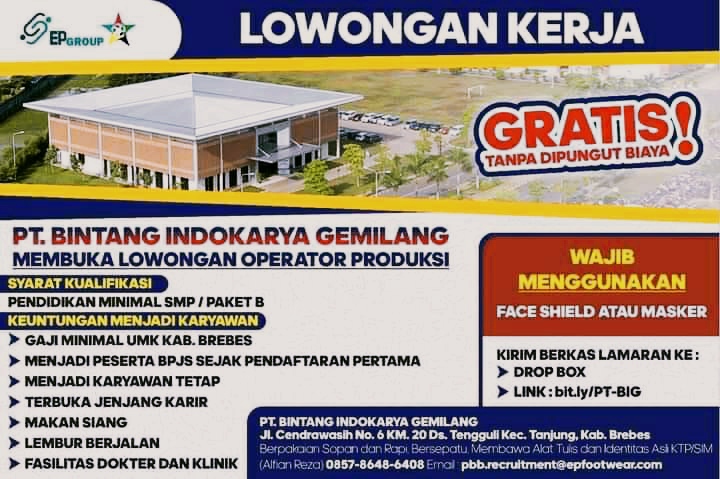 Pada kesempatan ini Saya ingin membagikan informasi tentang lowongan terbaru brebes PT. Bintang Indokarya Gemilang. ini adalah Posisi dan persyaratan yang dilengkapi.