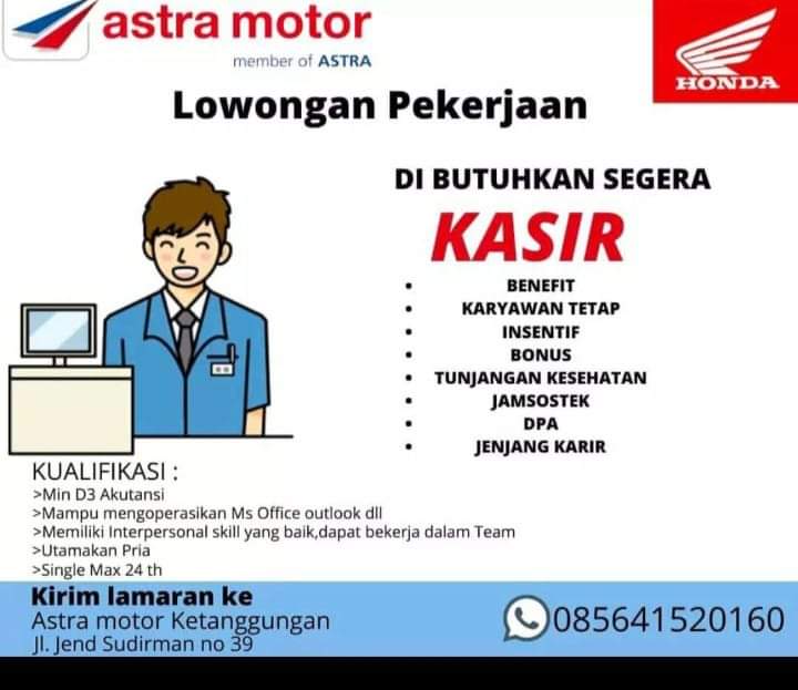 Pada kesempatan kali ini saya ingin memberikan informasi lowongan kerja Brebes terbaru di ASTRA MOTOR KETANGGUNGAN. Kualifikasi dan syarat yang dibutuhkan adalah sebagai berikut:
