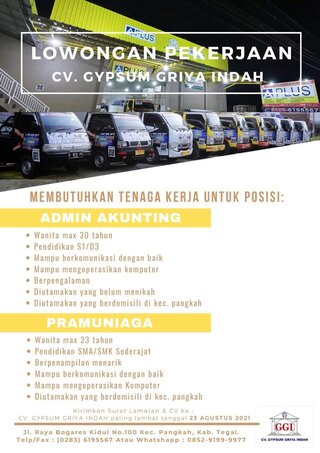 Pada kesempatan kali ini saya ingin memberikan informasi terbaru seputar lowongan kerja Tegal. Adapun posisi dan kualifikasi yang harus anda pahami untuk bisa bergabung di perusahaan CV. Gypsum Griya Indah berikut ini.