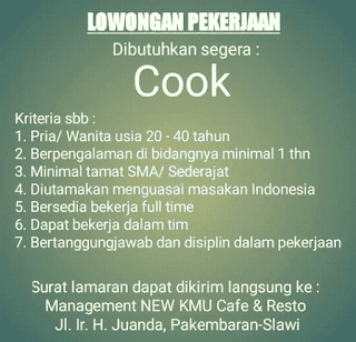 New KMU Cafe and Resto merupakaan sebuah tempat yang bergerak di bidang Cafe yang berada di daerah Slawi, Tegal. Saat ini sedang membutuhkan lowongan pekerjaan untuk di tempatkan pada posisi sebagai berikut.