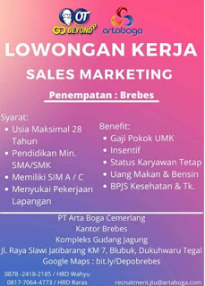 PT. Arta Boga Cemerlang adalah sebuah perusahaan yang bergerak di bidang Distributor Produk dari OT (Orang Tua Group) dan bertempat di Brebes. Saat ini sedang membuttuhkan lowongan pekerjaan untuk ditempatkan pada posisi sebagai berikut ini: