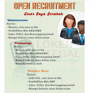 Sinar Jaya Gerabah merupakan sebuah tempat usaha yang bergerak di bidang penjualan perabotan rumah tangga yang bertempat di Tegal. Saat ini sedang membutuhkan tenaga kerja kompeten untuk mengisi posisi sebagai berikut :