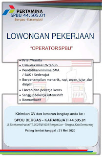 SPBU merupakan tempat pengisian bahan bakar milik Pertamina dan mempunyai cabang di seluruh Indonesia. Saat ini sedang membutuhkan calon tenaga kerja yang akan ditempatkan di Wilayah Semarang sebagai posisi berikut ini.